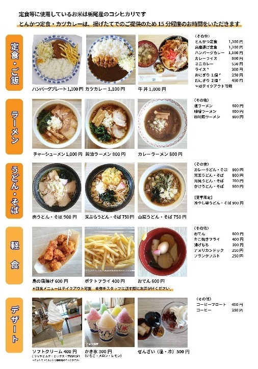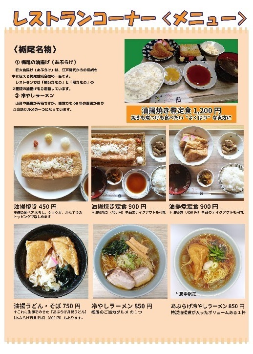 道の駅R290とちおレストランコーナー ⑪ 長岡市栃尾宮沢1764 道の駅R290とちお内0258-51-532110:00~18:00 17:30(LO)12/31~1/2休業、1/3は15時閉店デリバリー(出前):✕テイクアウト(持ち帰り):〇 テイクアウトメニュー おにぎり、ポテトフライ、フランクフルト、アメリカンドック、たこ焼きフライ、フライドチキン、ごま団子、揚げ餅、あぶらげ焼き、持ち帰りできます。 メニュー